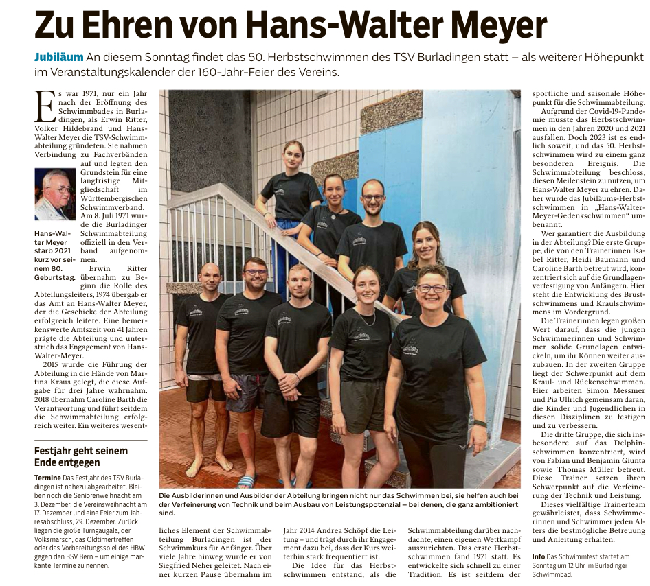 Am 51. Herbstschwimmfest, veranstaltet vom TSV Burladingen und Turngau Zollern-Schalksburg, nahmen 123 Schwimmerinnen und Schwimmer aus sieben Vereinen teil. Es gab insgesamt 141 Starts.