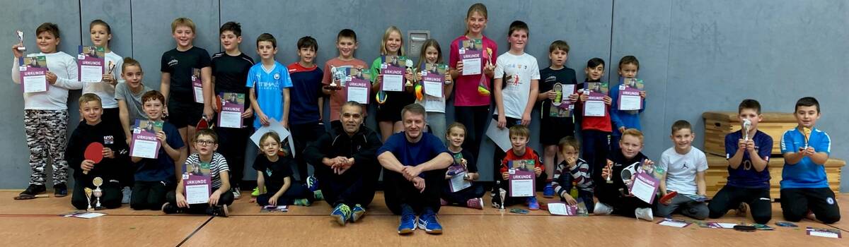 Zu den mini-Meisterschaften 2023 fanden sich erfreulicherweise 26 Jungen und Mädchen in der Burladinger Arena ein. Die Turnierleitung übernahmen Thomas und Michael, die von zahlreichen Helfer*innen (Lena, Ralf, Sven und Berthold) unterstützt wurden. Gespielt wurde in 6er und 7er Gruppen gemischt jeder gegen jeden. Die vier Bestplatzierten der jeweiligen Gruppe spielten dann in einem 16er KO Feld den Sieger aus. Es gab aber keine wirklichen Verlierer, da jeder Platz ausgespielt wurde. Jeweils ohne Niederlage zogen dann Luka und Theresa ins Finale ein. In einem für mini-Meisterschaften hochklassigen Endspiel konnte sich letztendlich Luka durchsetzen und blieb dabei ohne Satzverlust während des gesamten Turniers. Theresa wurde als Zweitplatzierte bestes Mädchen. Die besten des jeweiligen Jahrgangs dürfen nun im Februar zu den Bezirksendscheiden nach Derendingen.